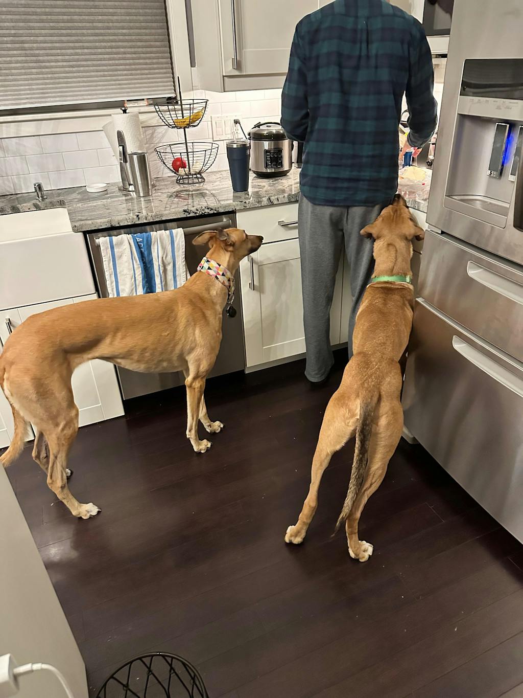 Earlier this year we adopted a rescue greyhound who has VERY picky taste (ie, she turns her nose up at peanut butter lol). We found 2 Dogs treats (both chicken and beef) and never looked back. It’s the only treat she takes, and the only treat that incentivizes her to come/stay/lay down/etc etc etc. The picture is of our Bernie girl (left) and our neighbor’s foster (Atticus, right) who is also obsessed…begging for treats while my husband opens a new package. We’re so thankful we found a cheat code!!